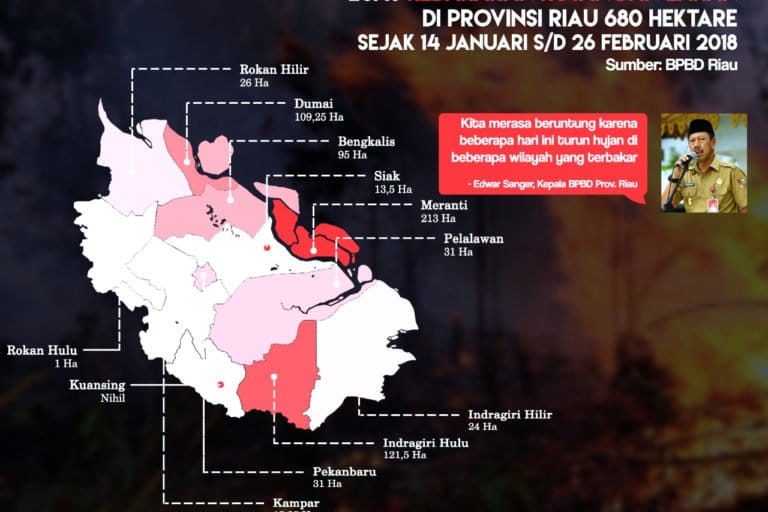Lahan terbakar selama 2018, 1.870,96 hektar. Kepulauan Meranti paling luas, 896,61 hektar, Bengkalis 345,5 hektar dan Indragiri Hulu 128,5 hektar.
