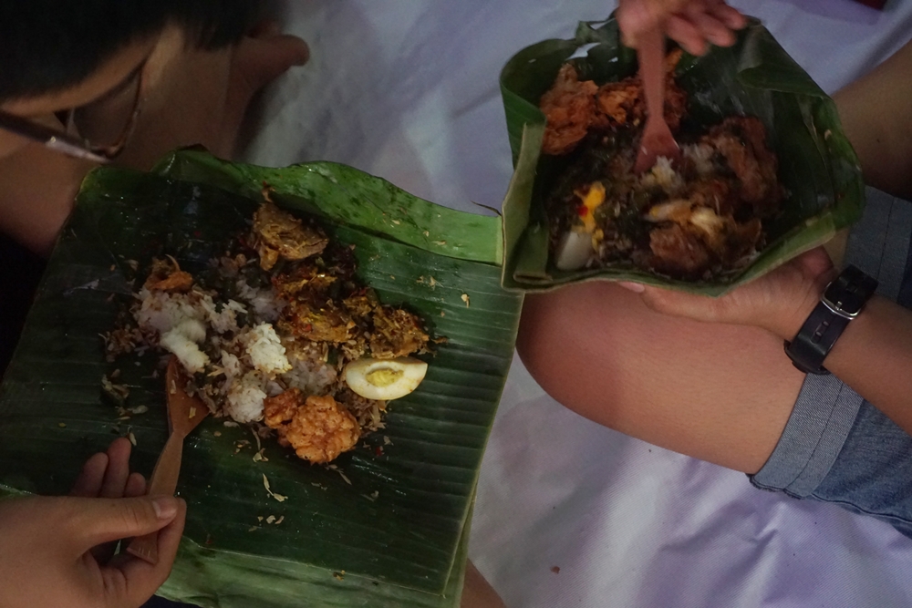 Ada juga pasangan Margaret dan Aidil yang siap dengan perlengkapan aneka wadah dan tas belanja. Keduanya bahkan membawa sendok kayu untuk sesi makan bersama nasi jinggo wadah daun yang disiapkan panitia saat waktu buka puasa.