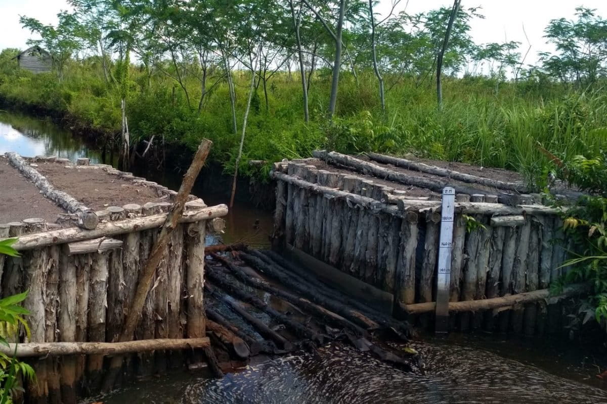 Saat berkunjung ke lokasi Blok C bulan Mei lalu, Mongabay Indonesia melihat kontruksi kayu berjajar menutup saluran kanal primer dari Blok C ke arah Desa Kalawa sudah terbangun. Untuk mengalirkan air, sebuah saluran kecil diantara konstruksi dibuat. Konstruksi dirancang agar aliran air tetap mengalir yang tak akan menimbulkan konstruksi terganggu atau jebol.