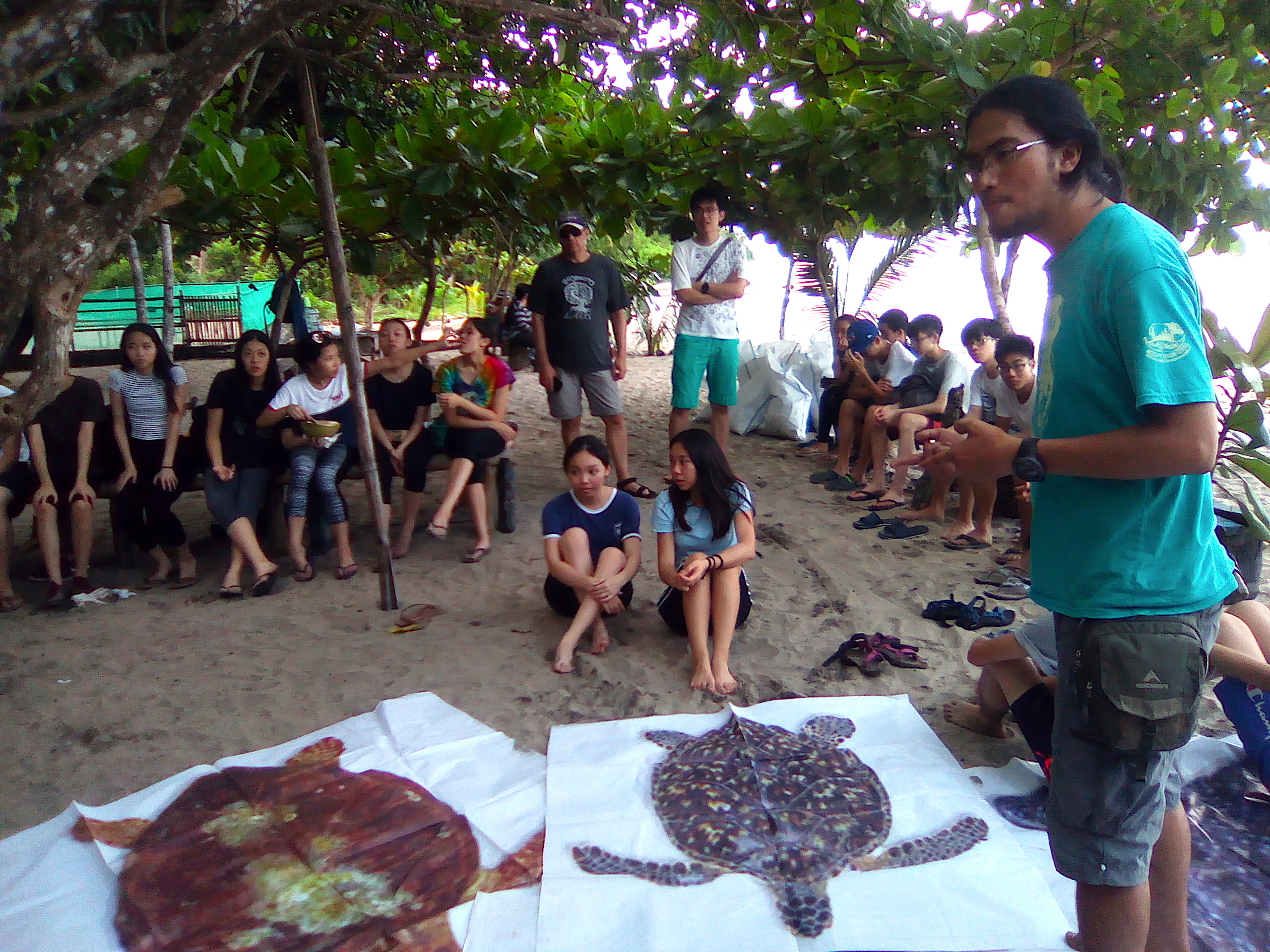 Billy Gustafianto Lolowang menggelar poster bergambar penyu di pantai Kawis, desa Tulap, kabupaten Minahasa, Sulawesi Utara. Billy adalah Manager Wlidlife Rescue & Endangered Species Pusat Penyelamatan Satwa Tasikoki (PPST). Dihadapannya, puluhan siswa-siswi dari Victoria Sanghai Academy, Hong Kong, memperhatikan dengan serius.