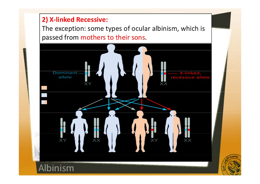 Gen OCA berlokasi di kromosom autosomal, sebagai hasil dari kelainan gen-gen resesif yang diturunkan dari orang tua (autosomal recessive). “Sebagian besar bentuk albino adalah autosomal recessive, dimana seorang anak yang albino dapat dilahirkan dari pasangan dengan rambut dan mata yang normal,” jelasnya.