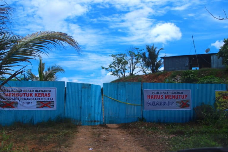 Di lokasi pembantaian juga masih terpasang beberapa spanduk cetak yang mendesak penangkaran buaya CV. Mitra Lestari Abadi ditutup.