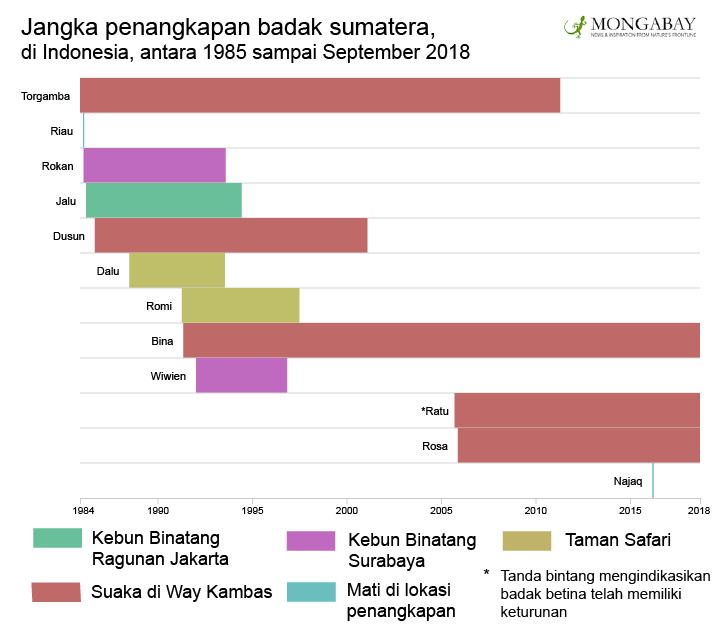 Badak yang ditangkap di Sumatera adalah satu-satunya yang paling proporsional: tujuh jantan dan sepuluh betina (tidak termasuk satu yang terbunuh dalam perangkap).