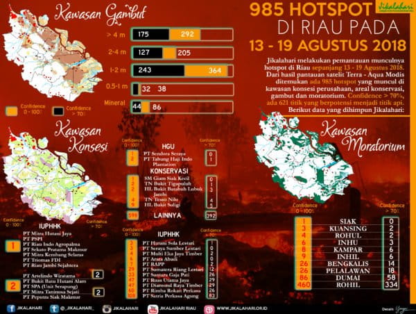 Pantauan mereka, dengan satelit Terra dan Aqua sepanjang Agustus menunjukkan, hampir tiap hari ada hotspot di grup perusahaan besar di Riau.
