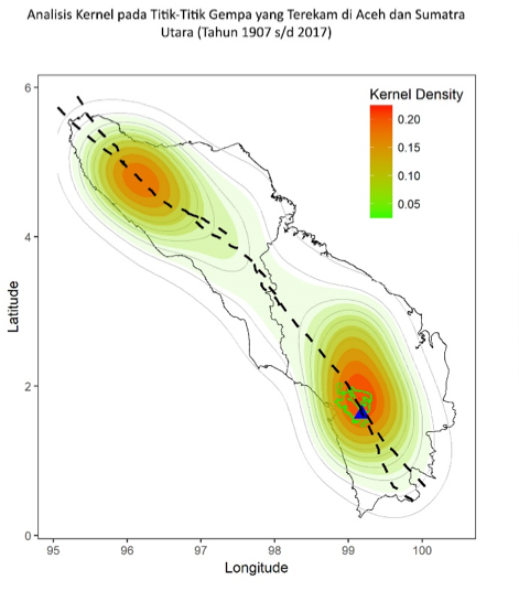 Apabila dilakukan analisis kernel pada persebaran dan intensitas gempa di daratan Sumatera ini, terdapat peta “kepadatan” kejadian gempa dengan dua pusat lokasi gempa tertinggi. Satu lokasi berada di Aceh bagian utara dan satu lagi Tapanuli, -lokasi bendungan akan dibangun.