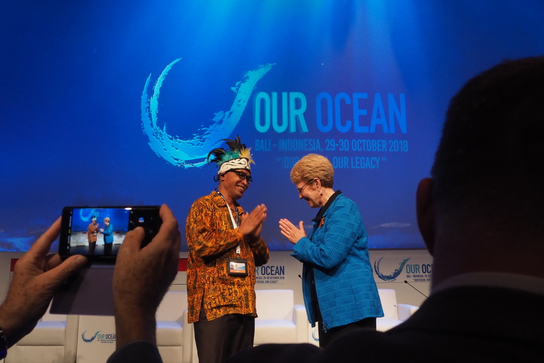 Abraham Goram, pemimpin masyarakat adat suku Maya Raja Ampat Papua Barat menyampaikan pendapatnya tersebut pada hari pertama Our Ocean Conference (OOC) 2018 di Nusa Dua, Bali, Senin (29/10). Abraham menjadi salah satu pembicara sesi pleno yang menghadirkan narasumber seperti Presiden Kaledonia Baru Philippe Germain dan mantan Perdana Menteri Australia Malcolm Turnbull.