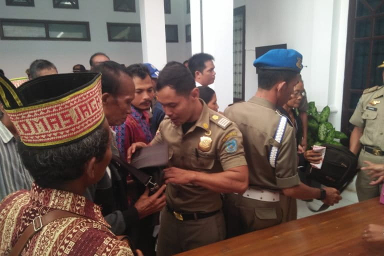 Para undangan dari Laman Kinipan pun dibuat kaget karena petugas Satpol PP bikin aturan ketat. Bak masuk ke dalam lembaga pemasyarakatan (Lapas), mereka dilarang membawa masuk tas dan telepon seluler.