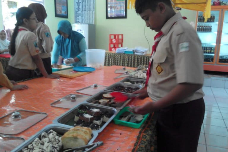 “Awalnya susah, takut ga laku. Sekarang sudah terbiasa,” kata Sri Wahyuni, pedagang kudapan. Sampah pun bisa dikurangi, dan makanan lebih sehat.