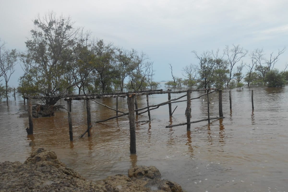 Keterangan foto utama: Abrasi yang terjadi di Teluk Nibung, Riau. Pertahanan dari mangrove yang menipis, menyebabkan daratan terus terkikis. Foto: Suryadi/ Mongabay Indonesia