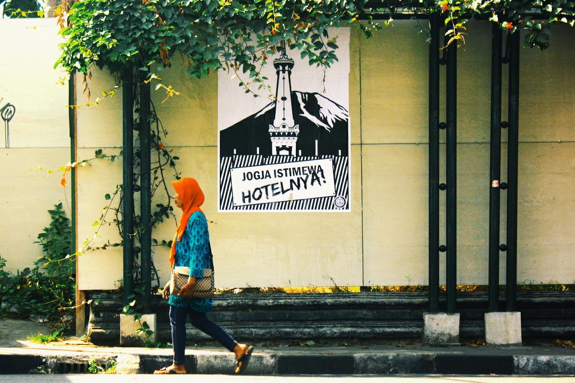 “Walihotel Yogyakarta.” Begitu gulungan kertas putih bertinta hitam di tembok. Lalu dia ambil kardus dan sebilah bambu menutupi bagian perut dan pinggang. Air kencing dia semburkan ke tulisan Walihotel itu.