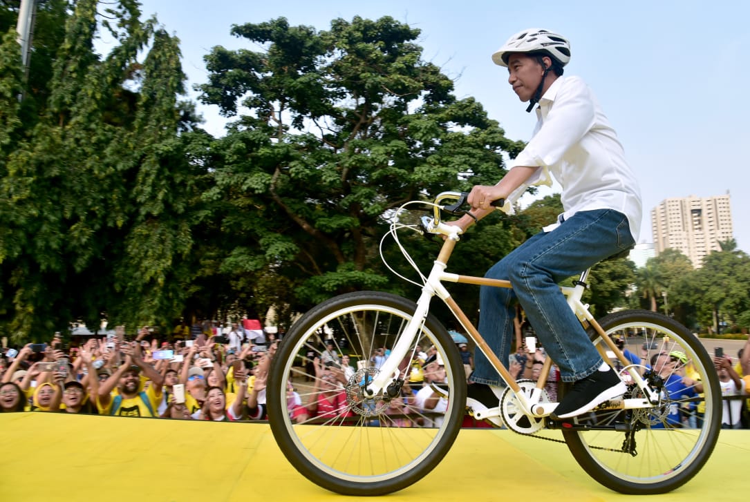 Presiden Joko Widodo, tampak mengayuh sepeda diiringi ratusan pesepeda lain menuju panggung di Plaza Tenggara Kompleks Gelora Bung Karno, Jakarta Pusat. Sabtu sore, 12 Januari itu, digelar deklarasi dukungan dari alumni Universitas Indonesia untuk pasangan presiden dan wakil presiden nomor urut satu, Joko Widodo-Ma’ruf Amin.