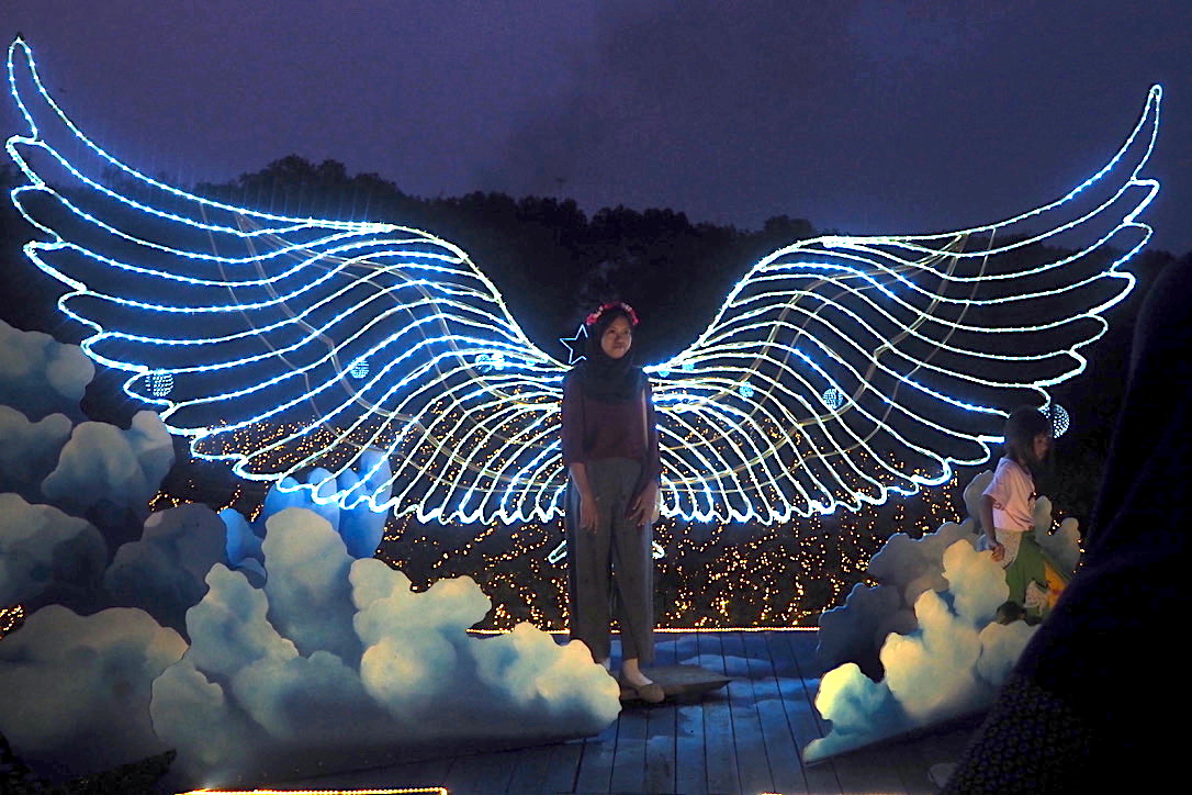 Ketika sudah petang, bukan gelap yang datang di BJBR tetapi indah lampu warna-warni di atas pohon bakau. Selain yang berbentuk aneka satwa laut, ada pula dibentuk serupa sayap malaikat ala mitos dewi asmara, Dewa Cupid. Hiasan ini melengkapi gembok cinta yang ditempelkan di salah satu titik.