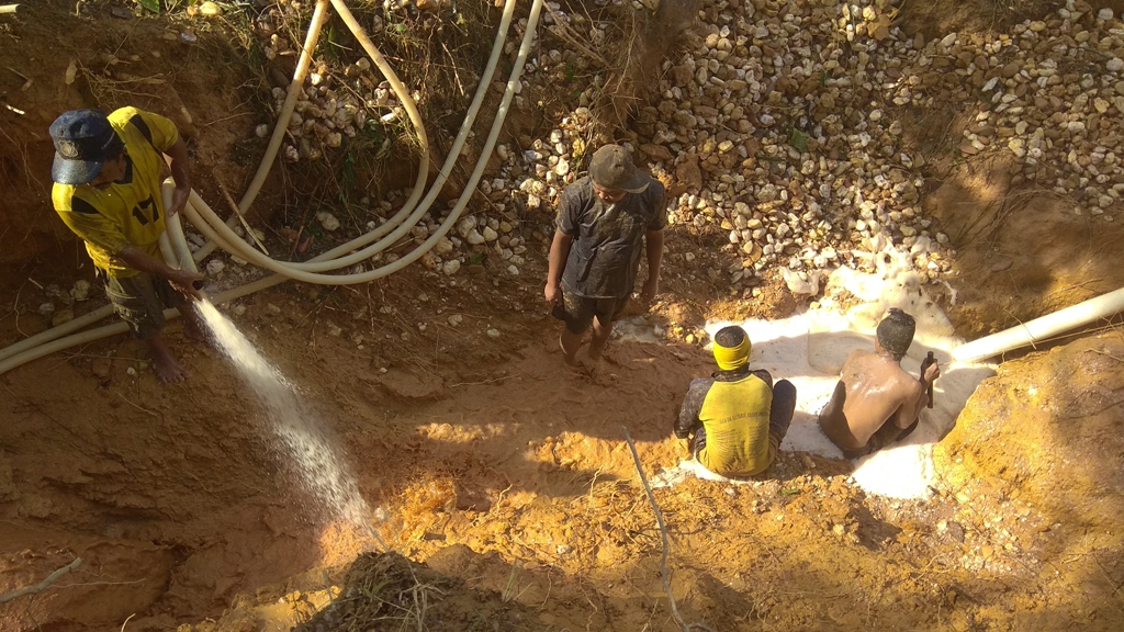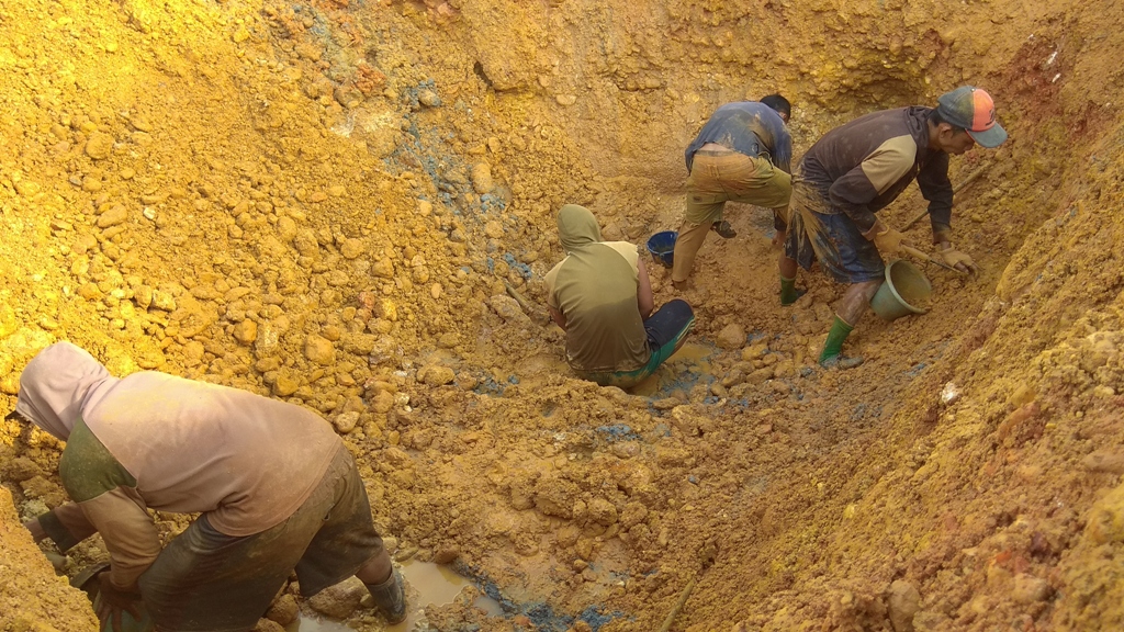 Sekitar 200 meter di belakang rumah Sukar, di Mengkadai, suara lima mesin dompeng keong empat seperti beradu keras, terdengar riuh di antara semak-semak di lahan tidur. Puluhan penambang emas berada dalam lubang besar sibuk membuang batu-batu sekepalan tangan, yang lain meruntuhkan tebing dengan menyemprotkan air yang keluar dari ujung selang berukuran satu setengah inch.