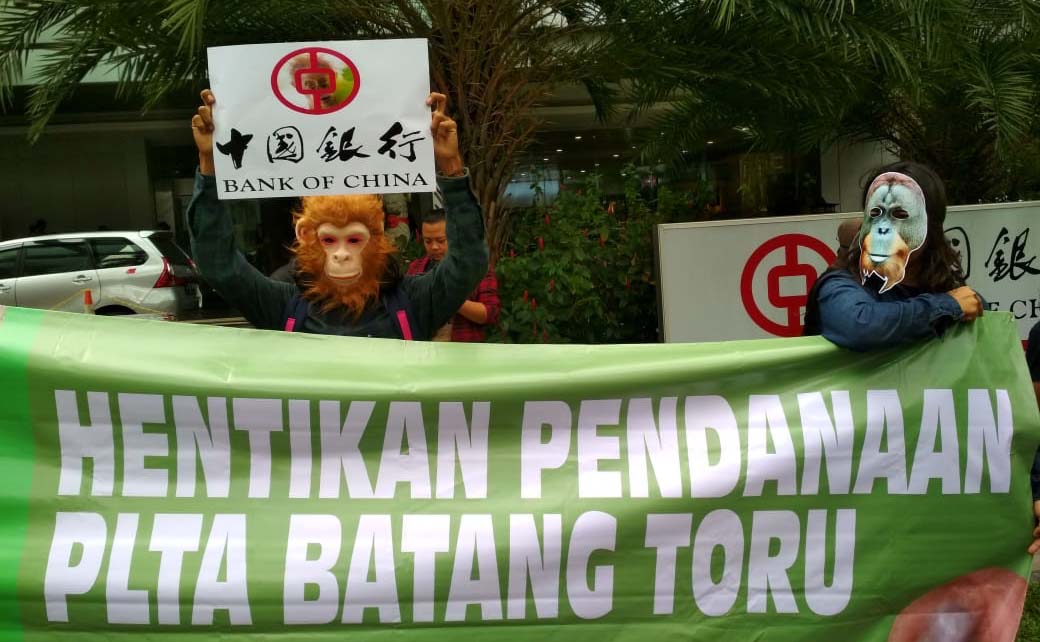Di Jakarta, para aktivis berkumpul di depan Kantor Bank of China di Mega Kuningan Jakarta, Jumat (1/3/19). Mereka membentangkan spanduk bertuliskan “Hentikan Pendanaan PLTA Batang Toru.” Sebagian dari mereka pakai topeng orangutan Tapanuli.