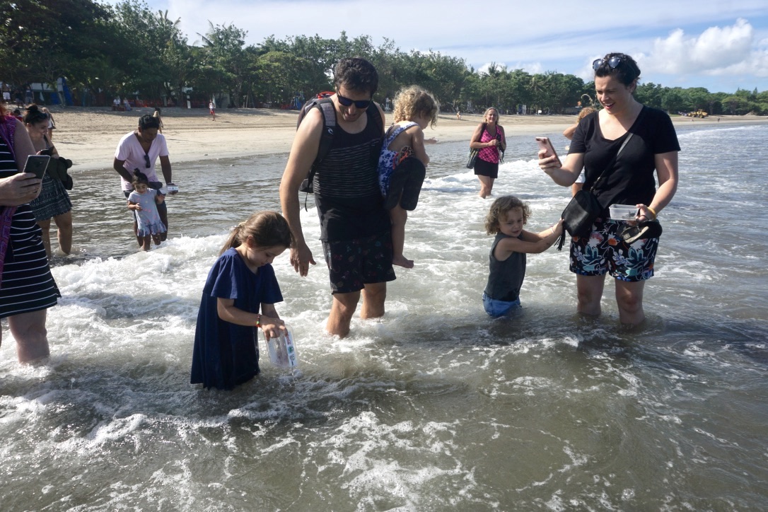 Anak-anak yang memegang kotak plastik berisi satu tukik segera berhamburan ke pantai ditemani orang tuanya. Mereka memanjatkan doa agar si tukik selamat bisa besar dan kembali lagi bertelur. Kemudian melepaskannya langsung di air laut saat gelombang datang. Tukik terlihat kaget, terengah-engah dengan arus Pantai Kuta yang cukup keras, setelah tenggelam sesaat kepalanya menjulur ke udara sambil mengikuti irama arus.