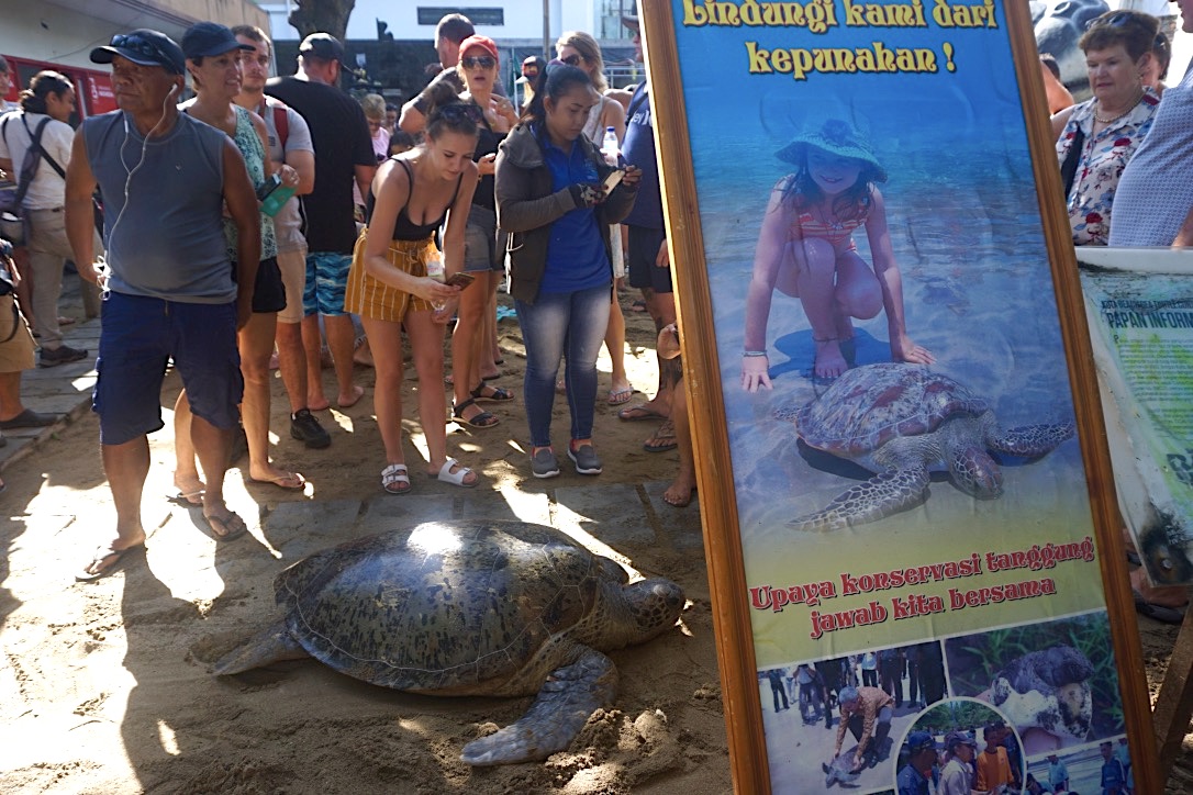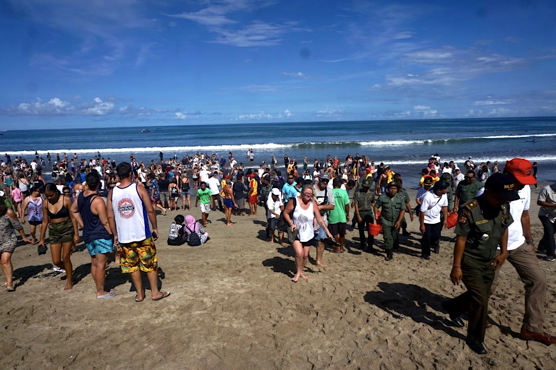 Gusti Agung Tresna, Tokoh Satgas Pantai Kuta menjadi memberi komando turis untuk mendekat laut dan mendengarkan aba-abanya. “Dont touch the baby turtles,” serunya lewat pengeras suara berkali-kali. Untuk mengurangi tingkat stres tukik sebelum melangkah menuju laut lepas.
