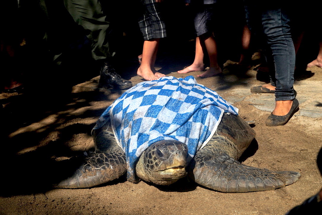Seekor penyu hijau terbesar, panjang karapasnya hampir satu meter dengan berat lebih 100 kg, harus diangkat 3-4 orang. Terlihat aktif ingin bergerak terus saat diistirahatkan sebelum dikembalikan ke laut. Karapasnya ditutupi handuk basah oleh para relawan.