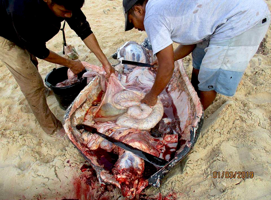 Berdasarkan penelusuran tim Balai Pengelolaan Sumberdaya Pesisir dan Laut [BPSPL] Padang, terhitung Februari hingga Maret 2019, sudah tiga individu penyu belimbing yang dieksekusi di kawasan pantai ini.