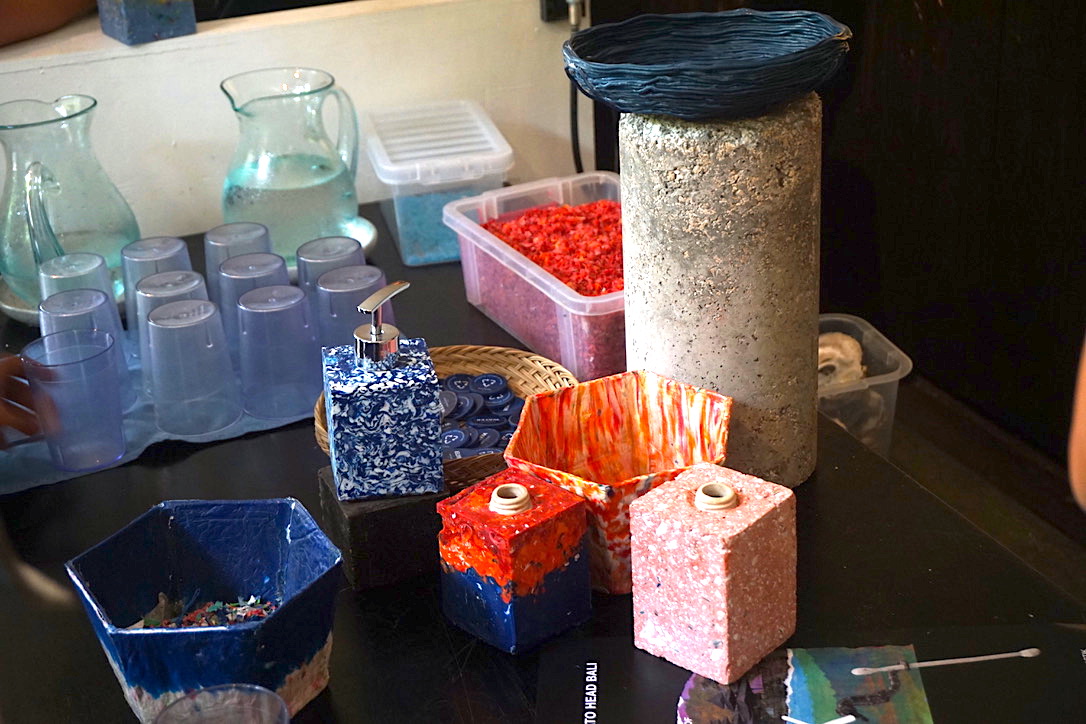 Sementara pengolahan tutup plastik botol dengan cara dicacah, oven 30 menit di alat khusus, lalu cetak jadi lempengan. Sisa styrofoam rencananya dicacah lalu campur semen dan pasir untuk jadi materi peredam suara di night club. Ada juga sisa restoran seperti cangkang kerang yang akan diolah sebagai dekorasi.