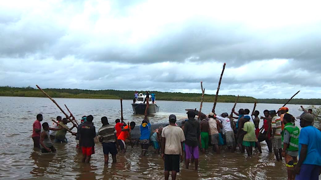 Dalam sejumlah foto dan video yang didapat Mongabay, proses evakuasi dibantu masyarakat sekitar dengan peralatan seadanya. Warga sedikitnya 30 orang, bermodal kayu bulat seukuran gengaman tangan, pada sungai berpasir itu, mendorong badan paus ketika speed petugas menarik di kejauhan secara bersamaan. Perlu beberapa kali upaya untuk bisa mendorong bangkai paus terlepas dari bibir sungai sebelum diseret ke seberang sungai.