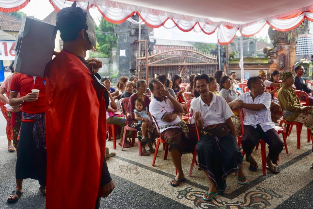 Gusti Ketut Arsa Wijaya, guru berusia 54 tahun ini berperan sebagai Thor dengan baju baja hitam dan jubah merah. Sementara rekannya, Kadek Andi Wijaya, berpakaian Spiderman warna merah. “Saya diberi kesempatan untuk menarik warga agar senang, anak-anak, ibu-ibu senang,” ujar Arsa. Pria paruh baya ini sempat membuka pakaian superhero-nya karena kepanasan.