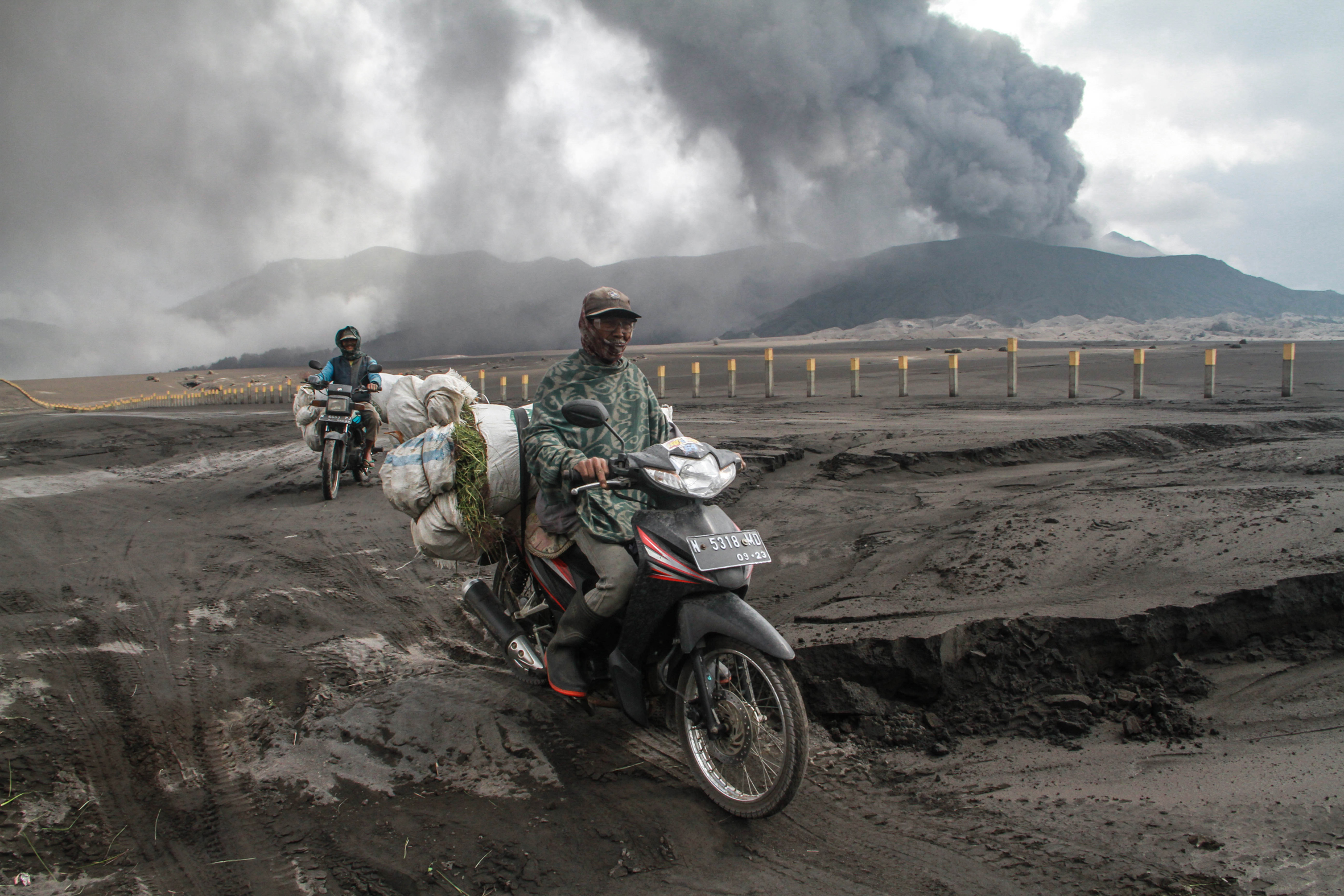Warga yang bekerja sebagai petani dan peternak tetap ke kebun. Sejumlah warga mengendarai motor membonceng rumput gajah untuk pakan ternak melintasi lautan pasir.