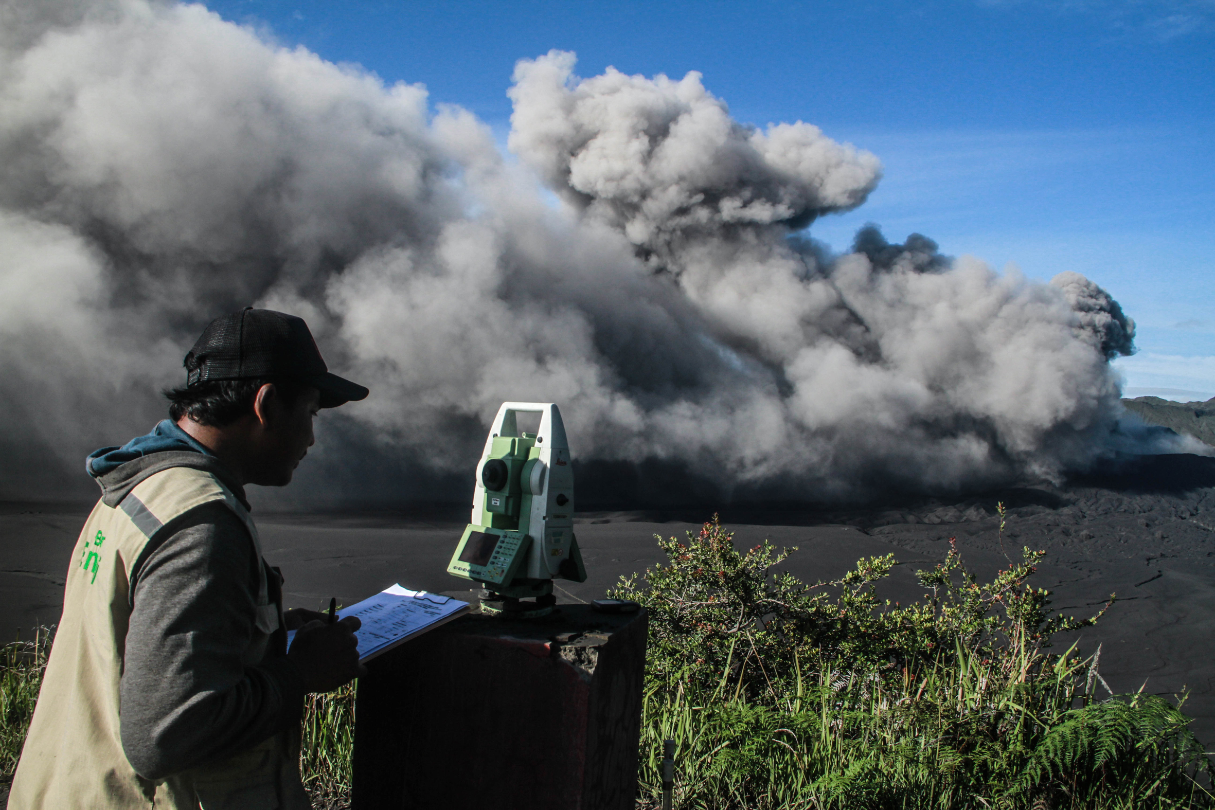 Kunjungan ke Bromo, katanya, sudah kali ketiga. Baru kali ini, bisa menyaksikan erupsi. Fenomena alam itu dia abadikan dengan kamera. Untuk menepis abu vulkanis, dia kenakan syal penutup mulut dan hidung.