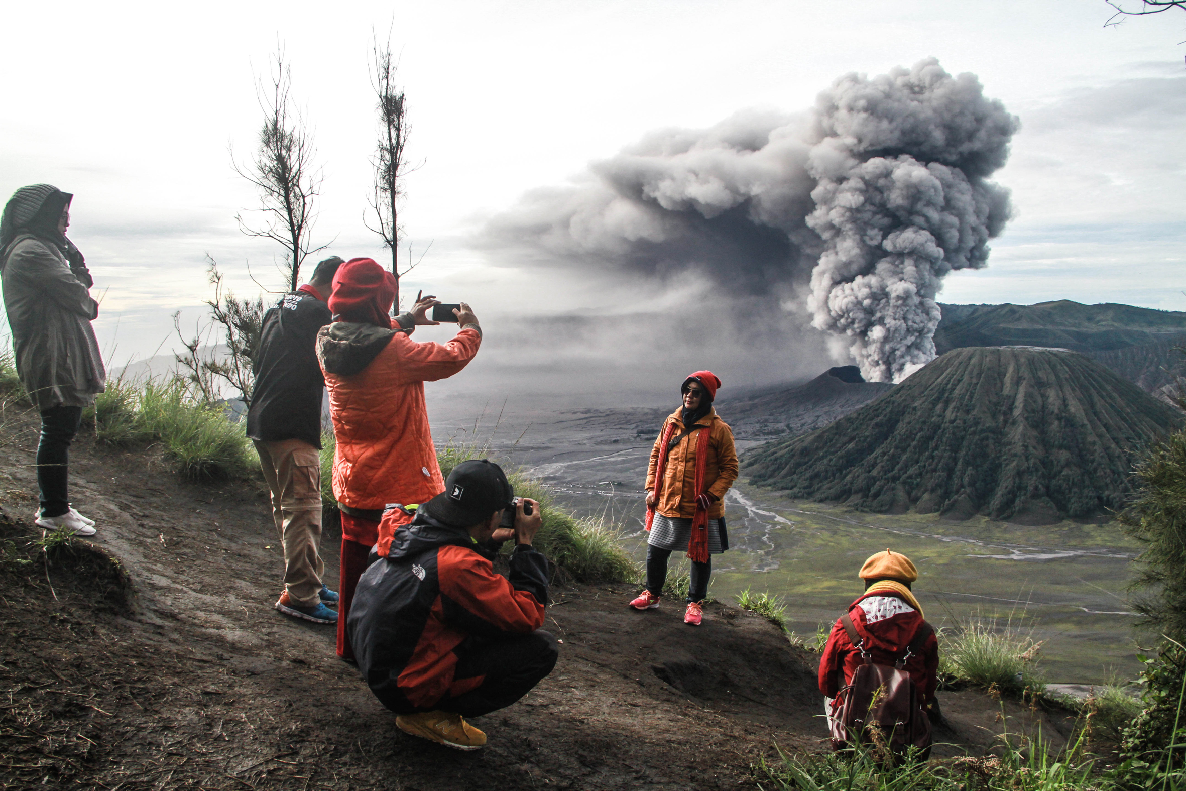 Banyak wisatawan berswafoto dengan latar Gunung Bromo yang tengah erupsi. Sadarman, wisatawan asal Jakarta, tak mengira kunjungan ke Gunung Bromo bertepatan dengan erupsi.