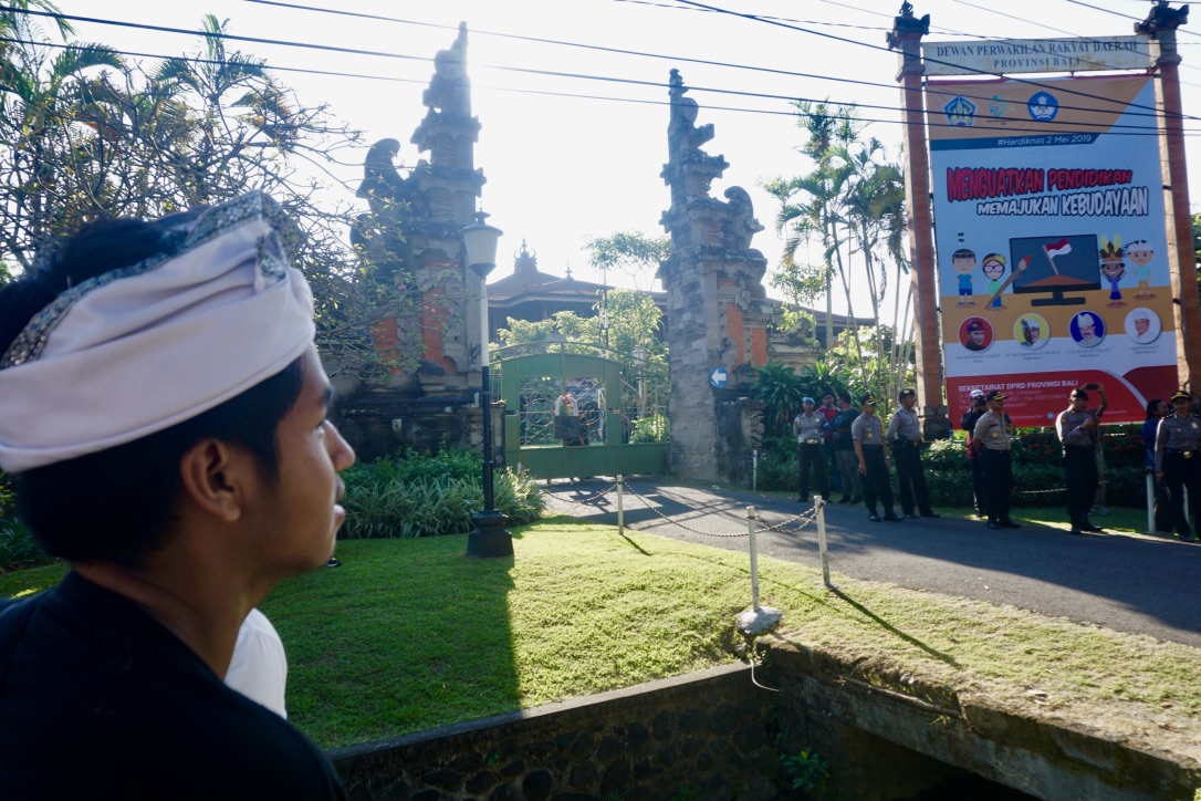 Keterangan foto utama : Seorang peserta aksi melihat replika gembok besar yang dipasang di gerbang DPRD Bali saat aksi ForBALI, pada Selasa (30/4/2019). Foto: Luh De Suriyani/Mongabay Indonesia