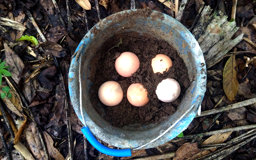 Di hamparan pasir tersebut, burung maleo [Macrocephalon maleo] meletakkan telur-telurnya. Madi [47], kolega Taufik dan Djaka, sudah lebih awal menggali lubang, mencari telur maleo. Telur-telur yang memang dipendam induk maleo, yang nantinya menetas dengan bantuan panas alami. Telur-telur yang didapat, dipindahkan ke bak penetasan semi alami yang dibangun swadaya, mereka bertiga.