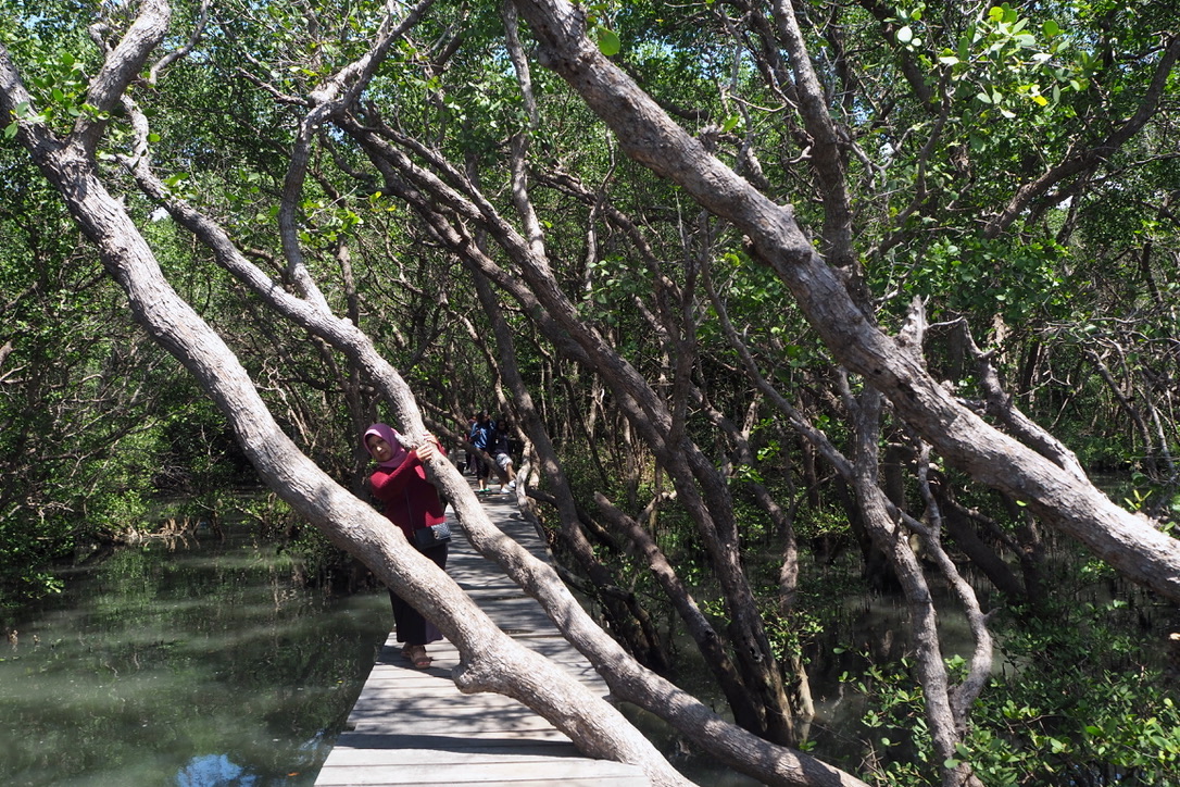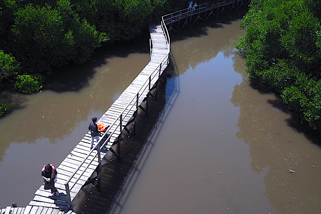 - Melihat hutan bakau dari atas ketinggian Pos Pemantauan atau menyusuri tengah hutan bakau dengan perahu bisa jadi pilihan selain hanya jalan-jalan di jalan panggung yang sudah disediakan