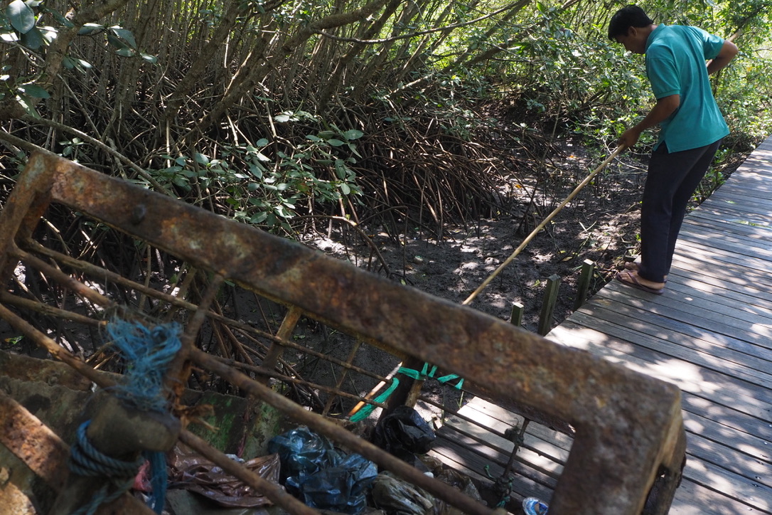 Bersihnya suasana di Tahura tak lepas dari peran petugas kebersihan seperti Nyoman Suardika. Pagi itu Suardika membersihkan plastik di antara akar-akar bakau lalu dimasukkan ke gerobak. Tiap hari dia membersihkan sekitar dari pukul 8 sampai 5 sore.