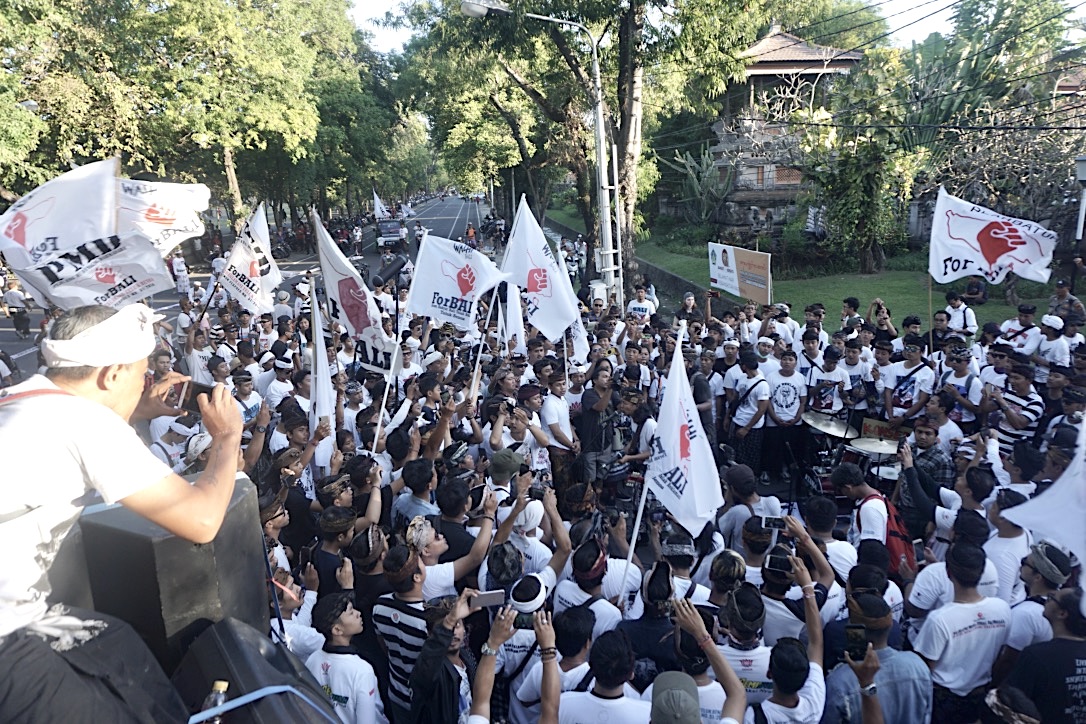 Dalam aksi longmarch pada Jumat (24/5/2019) di Denpasar, sejumlah peserta aksi memasang spanduk besar menutupi baliho DPRD Bali yang dipasang depan kantor megah parlemen daerah ini. Spanduk ForBALI ini bergambar tokoh pewayangan Sangut dengan tulisan “Jika Kalian Tidak Bersikap untuk Rakyat Maka Kalian Tak Ubahnya Seperti Sangut”. Deretan foto pimpinan DPRD Bali di baliho terlihat di bawah baliho.
