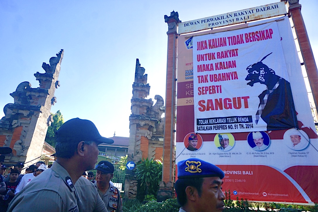 - Aksi longmarch Forum Rakyat Bali Tolak Reklamasi Teluk Benoa memasang spanduk besar menutupi baliho DPRD Bali
