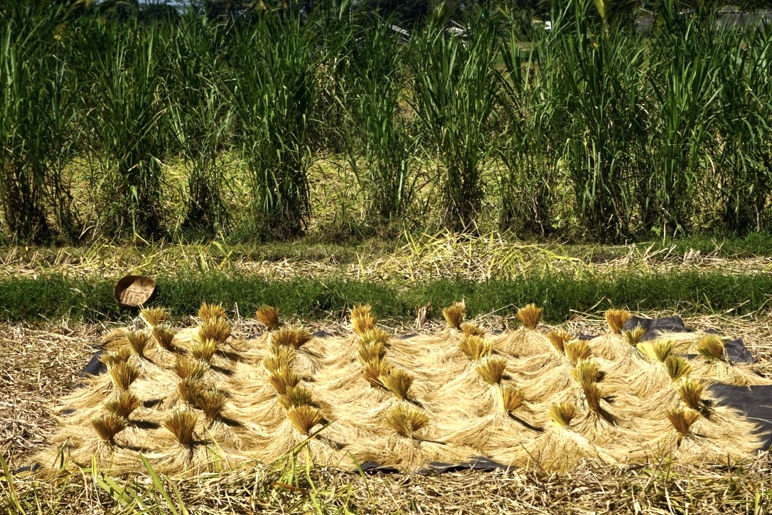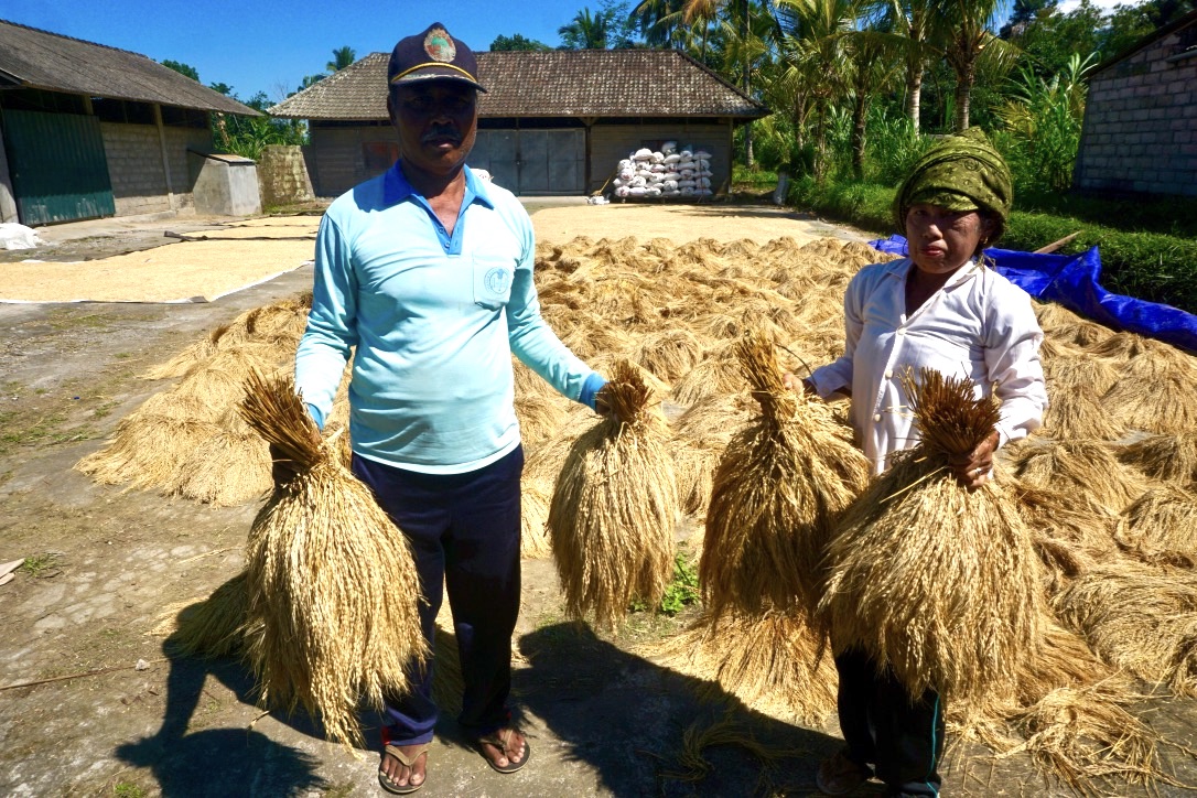 Pasangan petani Suparmi dan Suarca mengolah 10 are lahan dan mendapat panen sekitar 700 kg beras merah tahun ini. “Sekitar 90% lah, sisanya bagi dengan mahluk lain,” urai Suarca merujuk keiklasannya membagi untuk tikus dan burung.