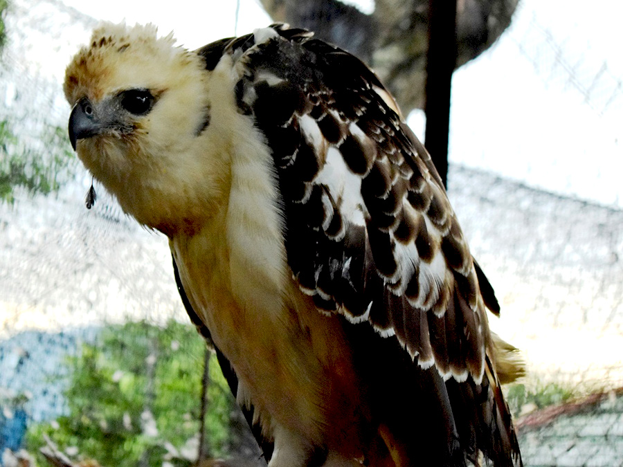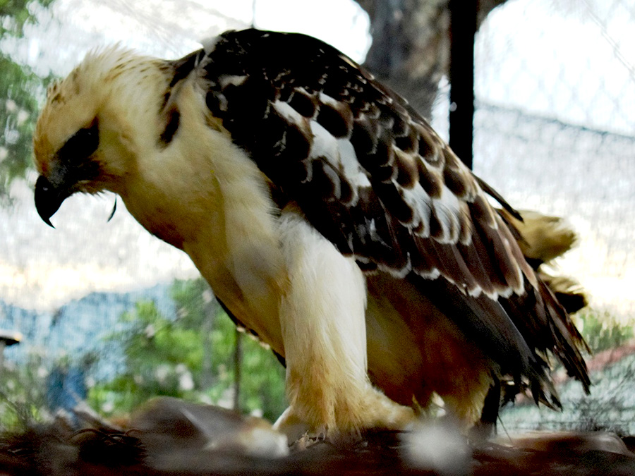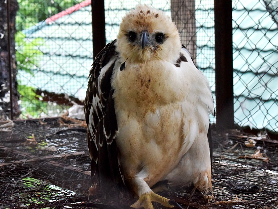 Satu individu elang flores [Nisaetus floris] betina terlihat di kandang perawatan di kantor Resort Wolojita, Balai Taman Nasional Kelimutu [TNK]. Kaki kirinya terluka.