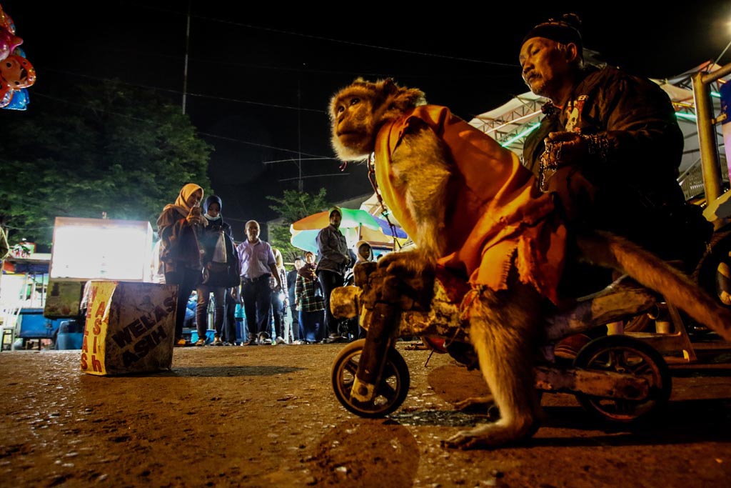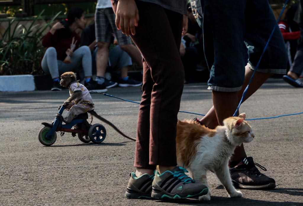 Di antara lalu lalang aktivitas para pengunjung, seekor monyet berjalan mengikuti perintah tuanya dengan menyodorkan sebuah kaleng.