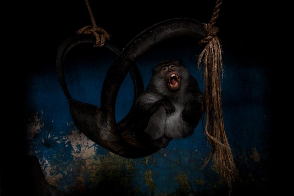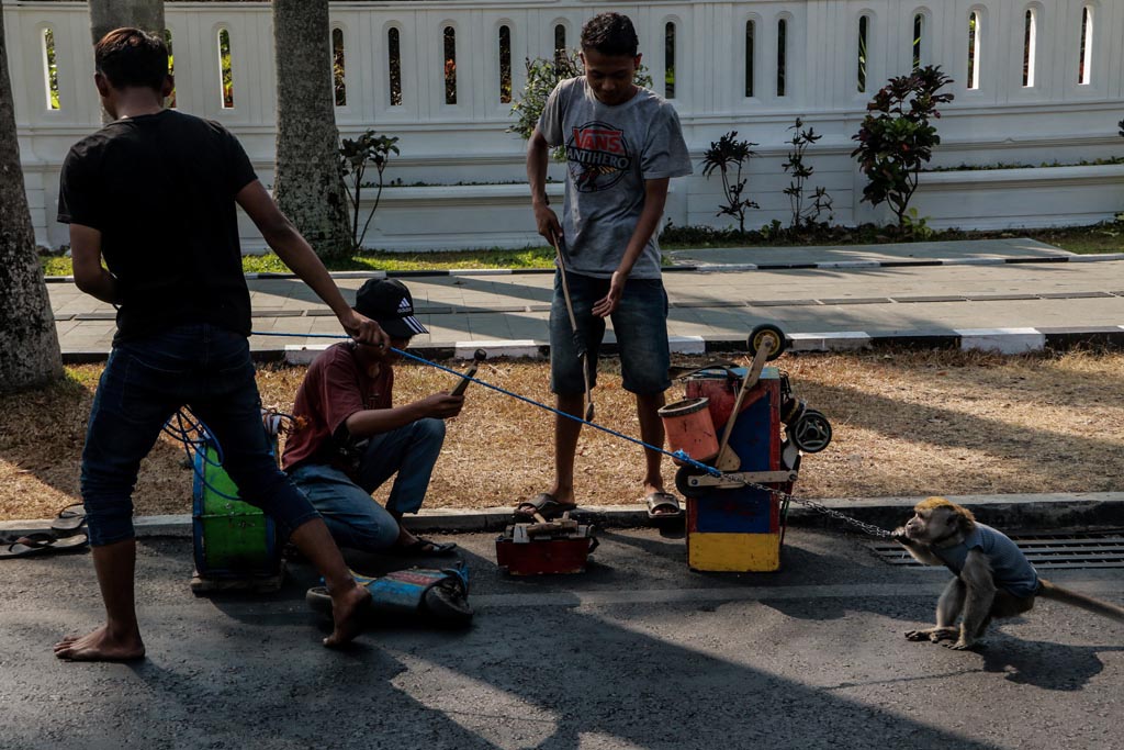 Jelang beberapa menit, monyet tersebut berganti berbagai peragaan tingkah laku yang dikehendaki oleh juragannya. Terkadang ia mencoba bertahan saat ditarik dengan menggunakan rantai besi yang disambung dengan tali plastik. Panjangnya kurang lebih 5 meter dari kalung jeratan di lehernya. Namun, kekuatan monyet itu masih kalah dengan kekuatan tuan yang membawanya.