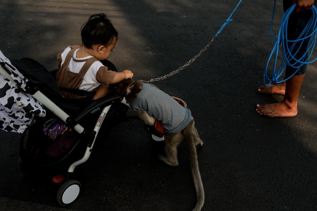 Di antara lalu-lalang wisatawan, seekor monyet menggunakan kostum warna merah bolak-balik berganti peragaan. Hal ini terkadang menarik para pengunjung, utamanya anak-anak. Mereka nampak antusias melihat tingkah laku monyet. Saat didekati, mamalia bernama latin Macaca fascicularis ini rasanya lebih jinak karena sering melakukan kontak fisik dengan manusia.