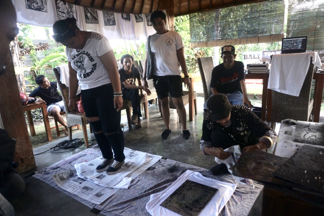 Jika belum memiliki kaus dengan desain-desain seperti yang dipamerkan, kolektif Bergerak Bersama Bali ini mempersilakan pengunjung membawa kausnya sendiri lalu disablon di lokasi, gratis. Misalnya Yulia, membawa 4 kaus untuk disablon, akan dibagikan untuk anaknya. Ia mengatakan terus mendukung gerakan tolak reklamasi ini walau sampai kini tak sependapat dengan suaminya. Ia mengaku lebih menyukai kaus dengan suara dan simbol perlawanan yang tak menunjukkan asal daerah.