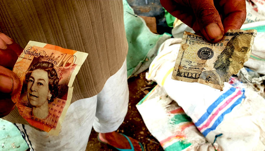 Dari pekerjaan memilah sampah plastik, Saji mengaku pernah beberapa kali menemukan tumpukan uang kertas mancanegara dalam kondisi rusak. Bahkan, dia juga pernah menemukan uang kertas asing dalam kondisi bagus, sehingga dapat ditukarkan sesuai kurs Rupiah. “Dapat 6 lembar uang Inggris. Dollar Amerika juga pernah dapat, tapi kebanyakan sobek atau rusak,” tuturnya.