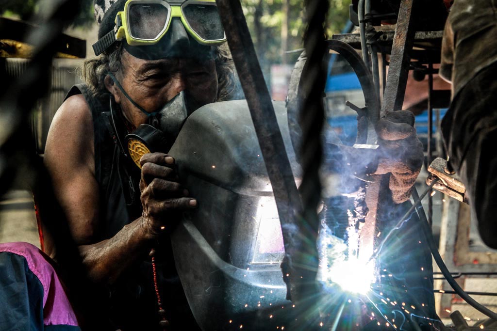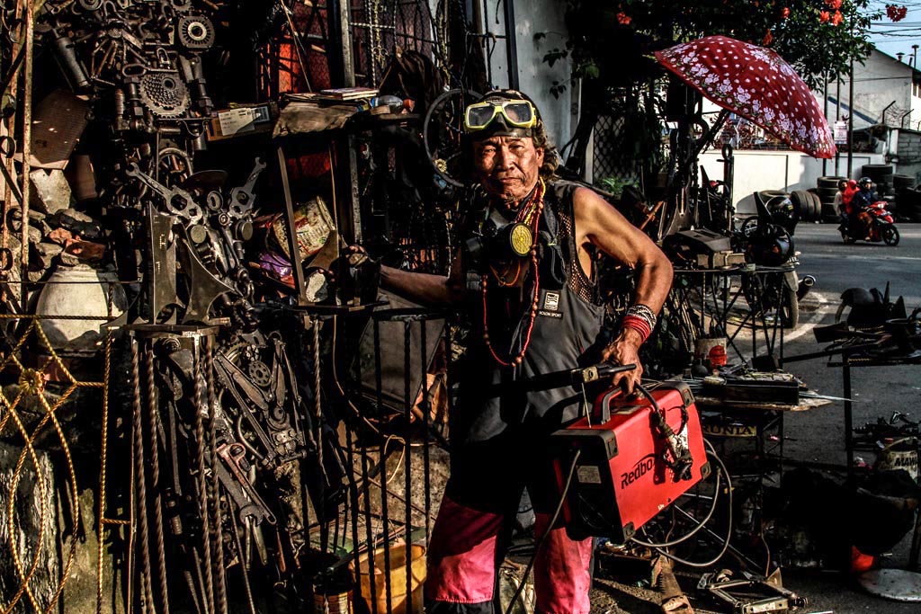 Sore itu, diantara lalu lalang kendaraan orang-orang pulang kerja yang berseliweran, lelaki berpakaian nyentrik terlihat sibuk menyambung besi-besi warna coklat berkarat, dari yang berukuran kecil sampai yang berukuran besar. Maklum, bersama rekanya lelaki paruh baya itu sedang melakukan kolaborasi membuat karya seni dari besi bekas, atau rongsokan.