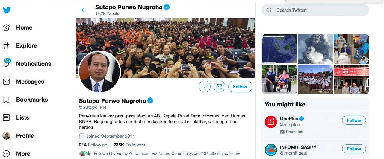 Ya, Sutopo Purwo Nugroho, Kepala Pusat Data dan Informasi Hubungan Masyarakat BNPB, yang sangat aktif mengabar berbagai informasi soal bencana ini telah berpulang. Sutopo menghembuskan nafas terakhir di Guangzhou, dalam perjuangan melawan kanker paru stadium 4B.