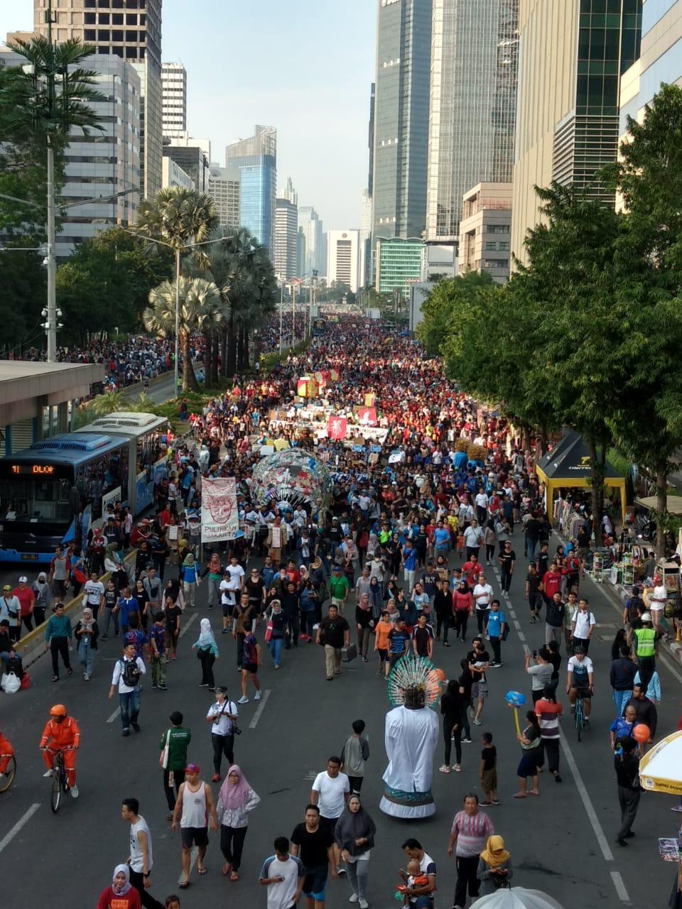 Ada yang berbeda dari gelaran car free day (CFD) yang rutin dilaksanakan di sepanjang Jalan Jenderal Sudirman dan Jalan MH Thamrin, Jakarta Pusat. Pada Minggu (21/72/2019) pagi, CFD kedatangan tamu berupa monster plastik raksasa yang tingginya mencapai empat meter. Monster itu diarak banyak orang dari sejak Bundaran HI hingga Taman Aspirasi, Silang Monas, yang berhadapan dengan Istana Negara.