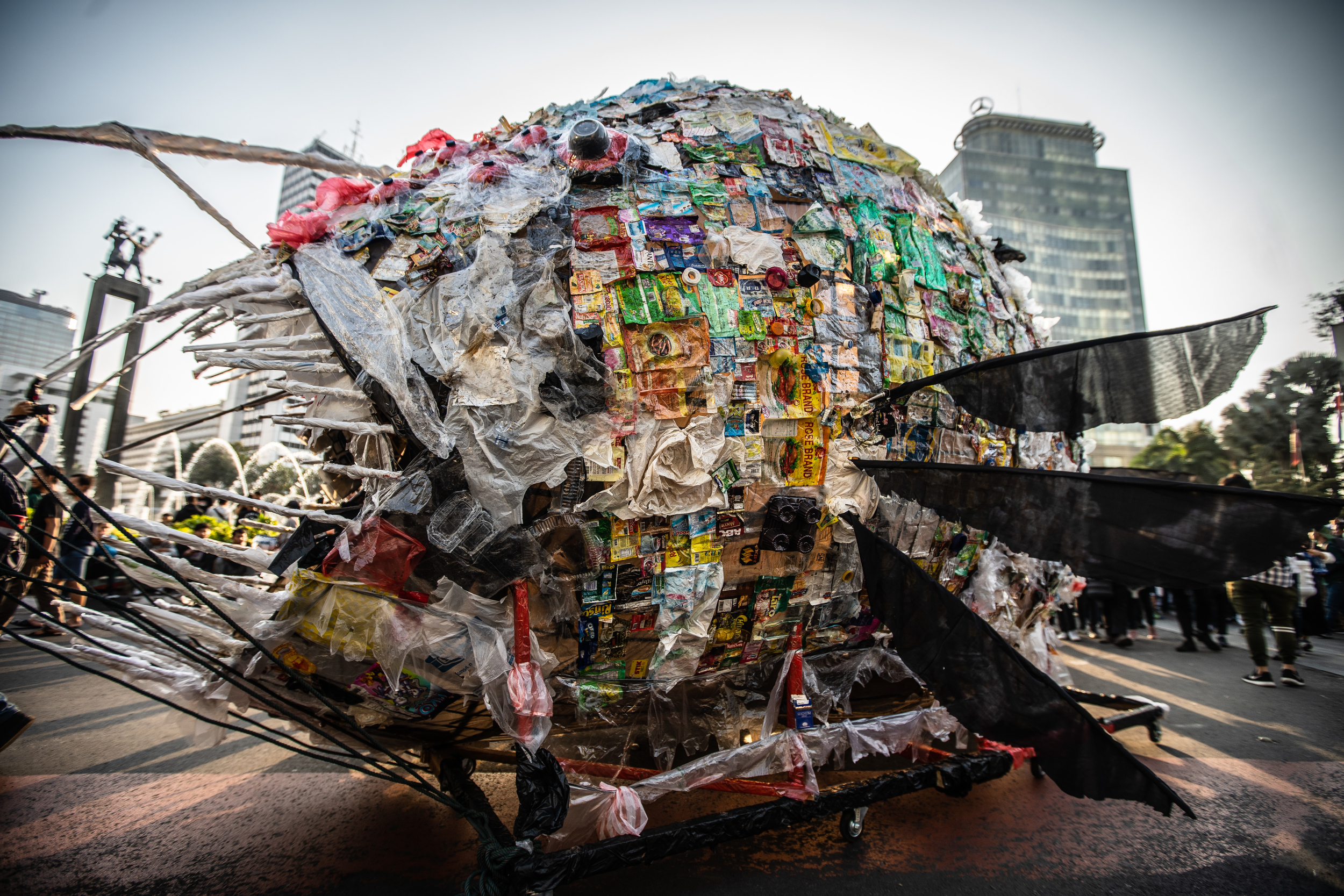 - Ancaman tentang plastik diekspresikan dalam bentuk monster plastik raksasa yang diarak pada pawai kampanye anti sampah plastik oleh 1.500-an orang dari koalisi 49 LSM lingkungan pada gelaran car free day (CFD) di Jalan MH Thamrin, Jakarta Pusat, Minggu (21/7/2019) kemarin.