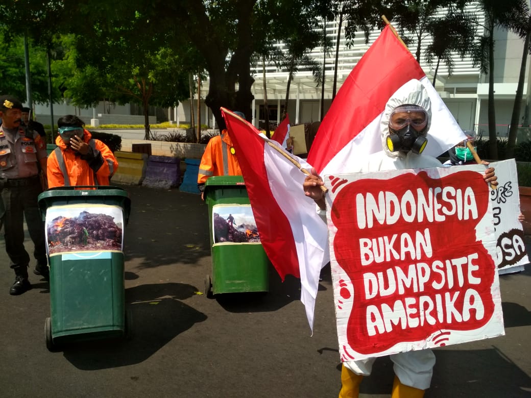 - Sebelumnya, juga ada aksi di depan Kedutaan Amerika Serikat, protes sampah-sampah impor dari negari Paman Sam ini yang masuk ke Indonesia. Jawa Timur, satu contoh, terdapat lebih 12 pabrik kertas yang gunakan bahan baku sampah kertas impor. Dari 43 negara eksportir sampah kertas, 10 negara pengekspor sampah kertas terbanyak ke Jawa Timur adalah Amerika Serikat, Italia, Inggris, Korea, Australia, Singapura, Yunani, Spanyol, Belanda dan New Zealand.