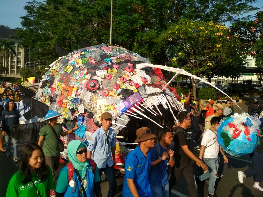 Minggu pagi (21/7/19), seribuan orang berkumpul di Bundaran Hotel Indonesia, Jakarta. Mereka membawa berbagai macam poster dengan tema ajakan tak lagi gunakan kantong plastik sekali pakai. Menteri Kelautan dan Perikanan Susi Pudjiastuti, bersepeda di depan ribuan warga, menjadi komando aksi. Persis di belakang Susi, sebuah replika monster ikan terbuat dari sampah plastik seberat 500 kilogram diarak para peserta aksi.