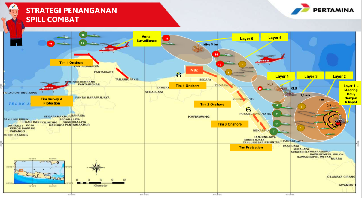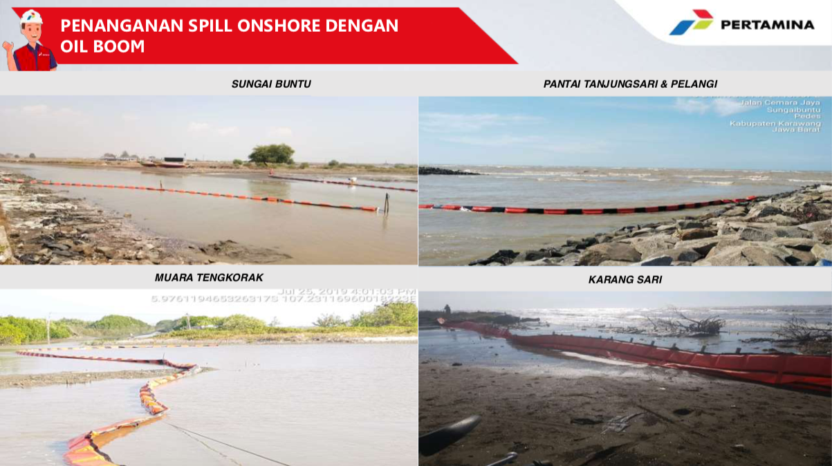 Selain menangani masyarakat terdampak, Nicke menyebutkan, pihaknya juga berupaya keras untuk melakukan penanganan di lokasi semburan minyak dengan memasang tujuh lapis alat untuk menghentikan sebaran minyak dan menyedotnya hingga bersih. Tujuh lapis tersebut, diklaim bisa bekerja dengan cepat dan efisien untuk membersihkan gumpalan-gumpalan minyak yang mencemari perairan.