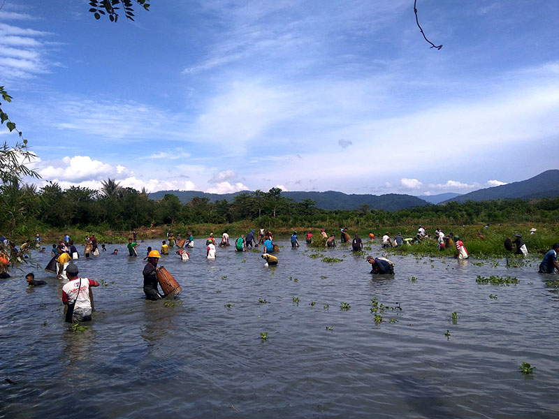 Pagi di saat matahari mulai meninggi. Orang-orang ramai di sudut kampung Desa Bewa, Kecamatan Lore Selatan, Kabupaten Poso. Mereka membawa alat penangkap ikan berbahan dasar bambu anyam. Jika bubu hanya ditaruh di bawah air sambil menunggu ikan masuk perangkap, alat ini dipakai aktif oleh penggunanya.