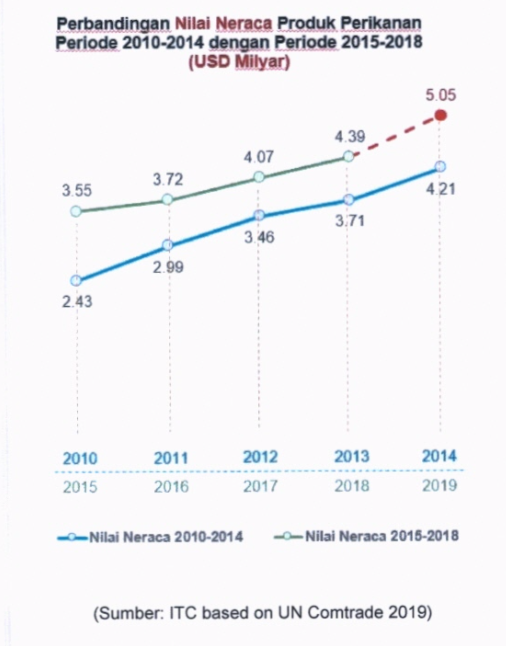 Dikutip dari UN Comtrade 2019, neraca perdagangan perikanan pada tahun 2015 sebesar USD3,55 miliar mengalami kenaikan menjadi USD3,72 miliar pada 2016. Kemudian pada 2017, kembali naik menjadi USD4,07 miliar dan naik menjadi USD4,39 miliar pada 2018. Bahkan diprediksi akan mencapai USD5,05 miliar pada tahun 2019.